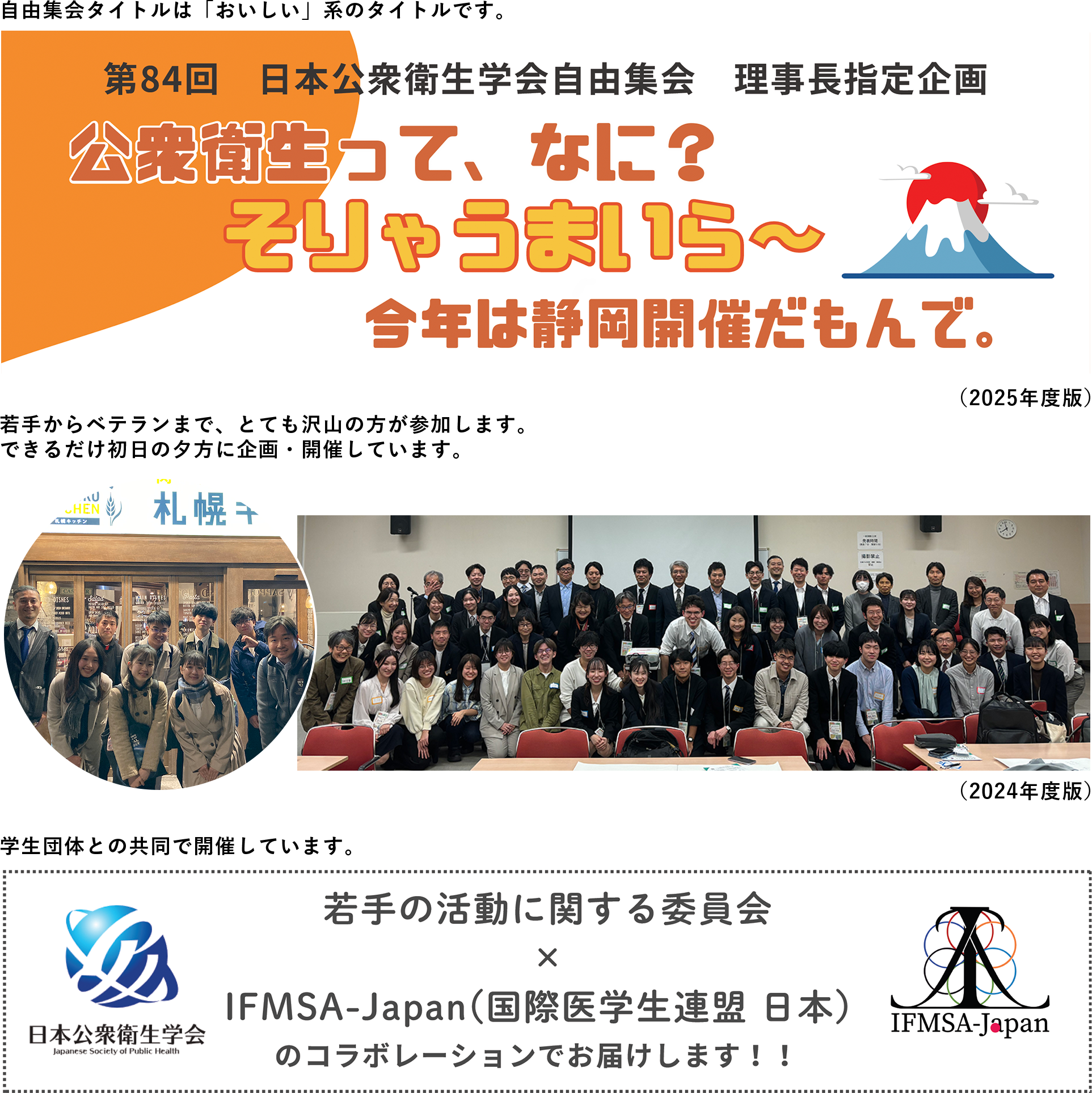 可能なら、総会・開会式から参加してスタート時のワクワク感を楽しんでください。3日間ず~と、シンポジウムもたくさんあって目からウロコの学びもあります。ランチョンセミナーも美味しいお弁当をめざして選んでもいいし、公衆衛生の仲間を増やそう、自分の名前を覚えてもらおう、という気持ちで、ぜひ!1日目夜の自由集会「公衆衛生ってなにそれ?美味しいの?」をチェックして、覗いてみてください。